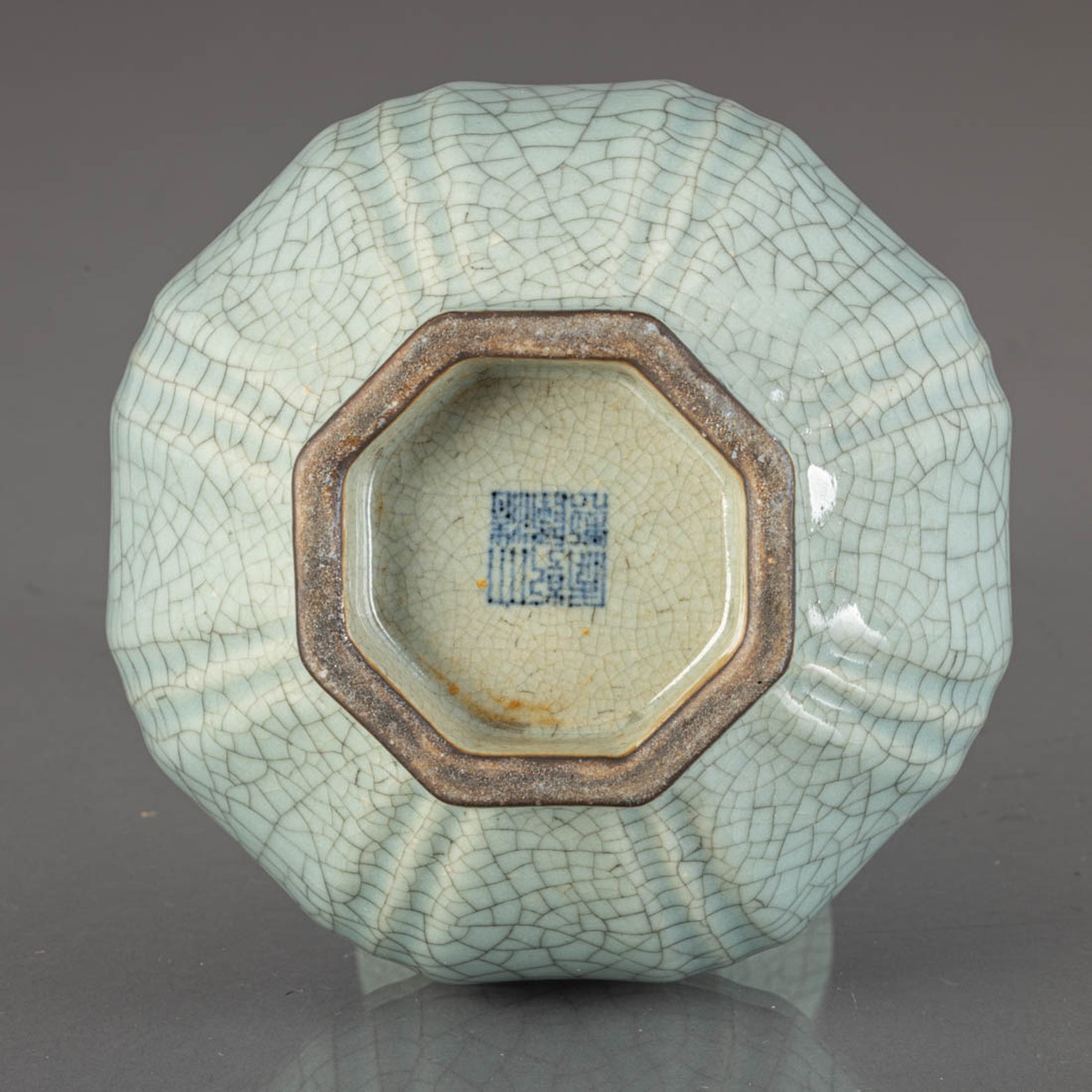 Em cerâmica chinesa vidrada, decoração "craquelé" sobre fundo Celadon. Marcada. Sinais de uso.