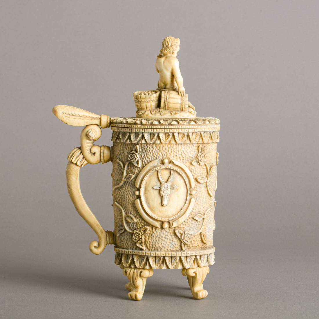 Em marfim esculpido, decorado com elementos vegetalistas, reservas representando meninos com cabra e tampa encimada por menino com uvas. Sinais de uso.