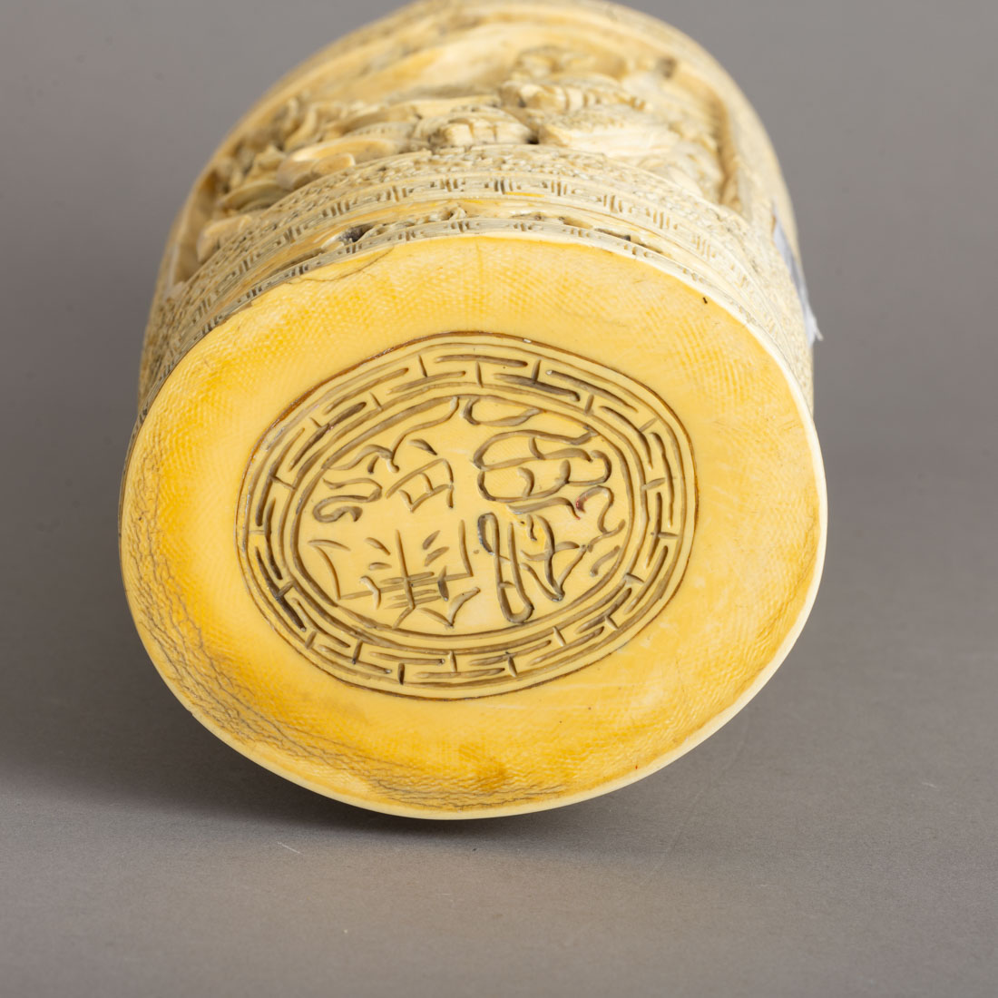 Em marfim minuciosamente esculpido, decoração com reservas representando cenas do quotidiano. Assinado. Sinais de uso e uma com falha.