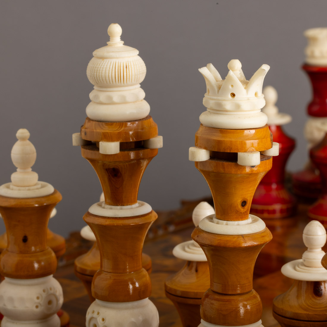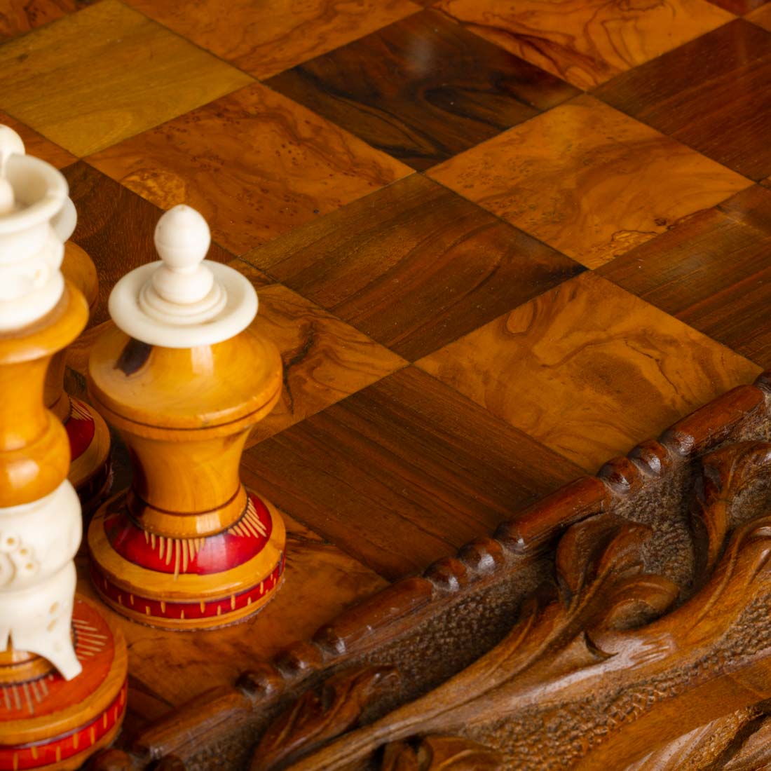 Tabuleiro nogueira e oliveira com entalhamentos vegetalistas, peças esculpidas em marfim e bucho. Séc. XX. Sinais de uso.