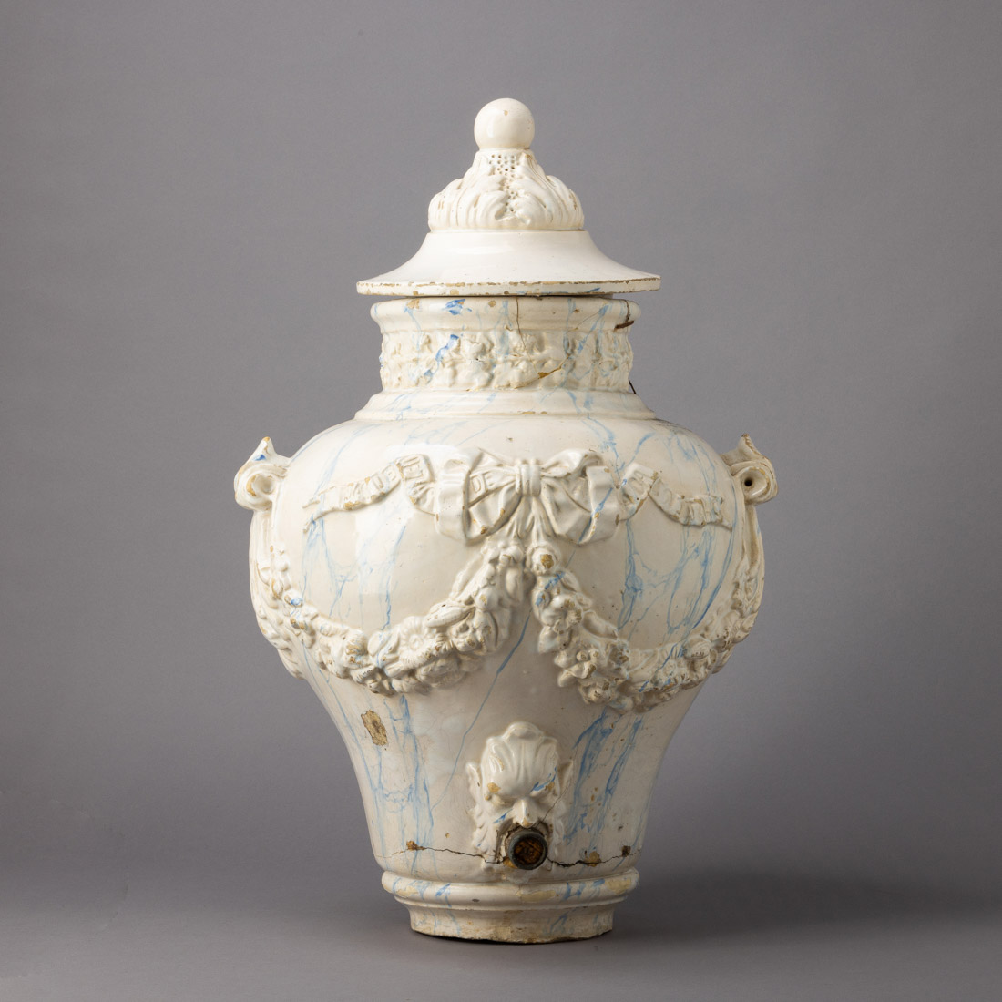 Em faiança possivelmente Devesas, decoração marmoreada e relevada com motivos florais. Falhas, esbeiçadelas, cabelos e gateada.
