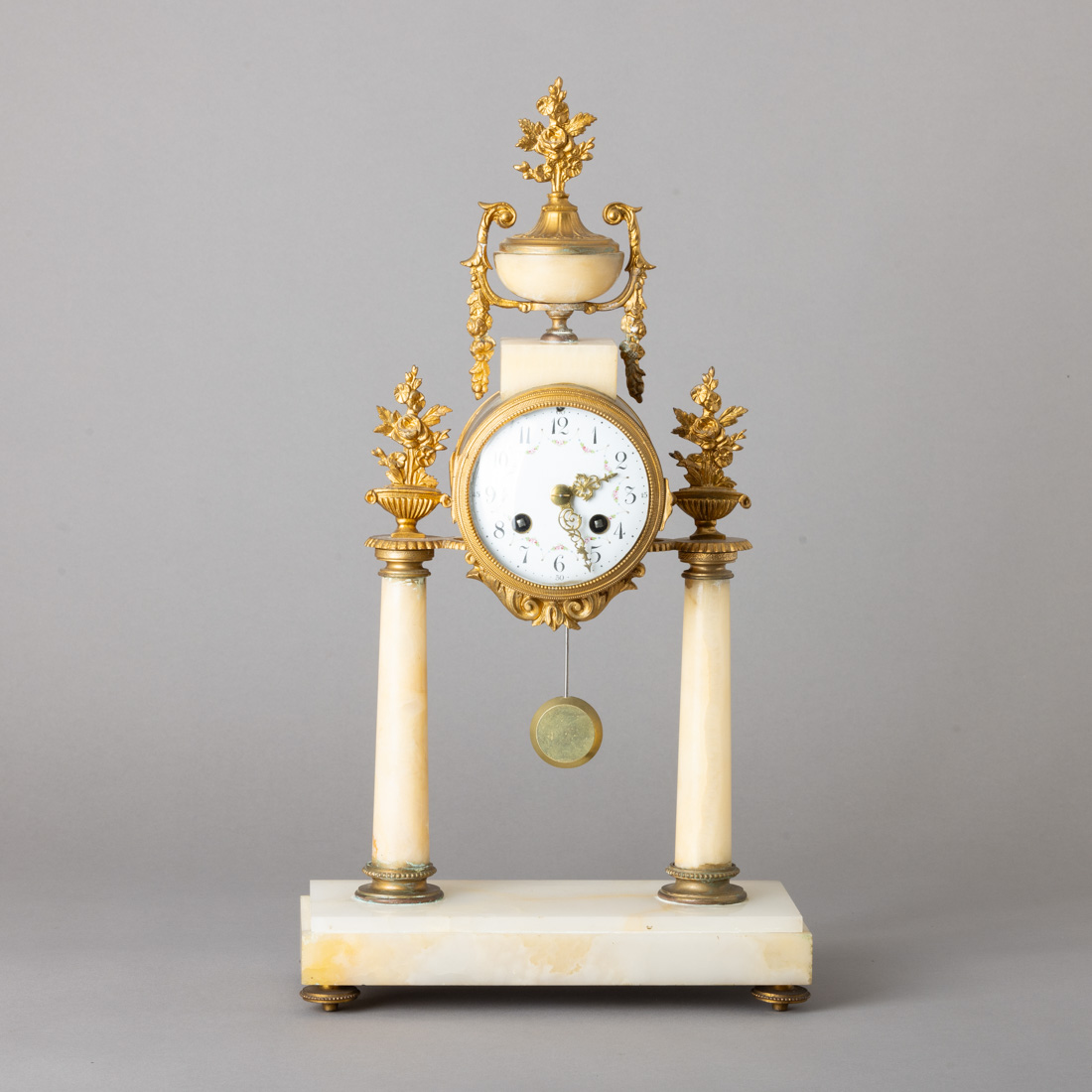 Em metal amarelo e alabastro. Mostrador em esmalte branco com numeração árabe a negro e decoração policromada "Grinaldas". Toca horas e meias horas em campainha. Em marcha. Pequenas falhas.