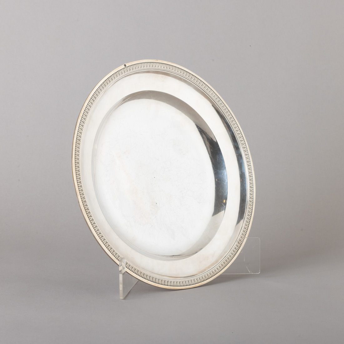 Em prata francesa de 950, marcas de garantia de teor, Séc. XIX, decoração lisa e friso gravado. Sinais de uso.