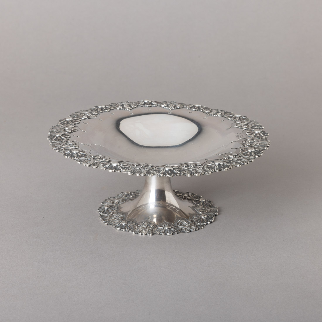 Em prata portuguesa contraste águia (1938-1984) de 916, marcada A.L. de Souza, Lda. - Lisboa, decoração relevada e vazada flores e enrolamentos. Sinais de uso.
