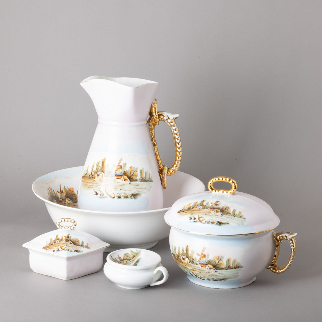 Em porcelana moldada e relevada (1881-1921), decoração policromada e dourada "paisagem", composto por jarro, bacia, penico com tampa, saboneteira e cuspideira. Sinais de uso, penico com esbeiçadela, asa colada e tampa com pequeno defeito no interior do bordo, saboneteira com esbeiçadela e desgaste no dourado.