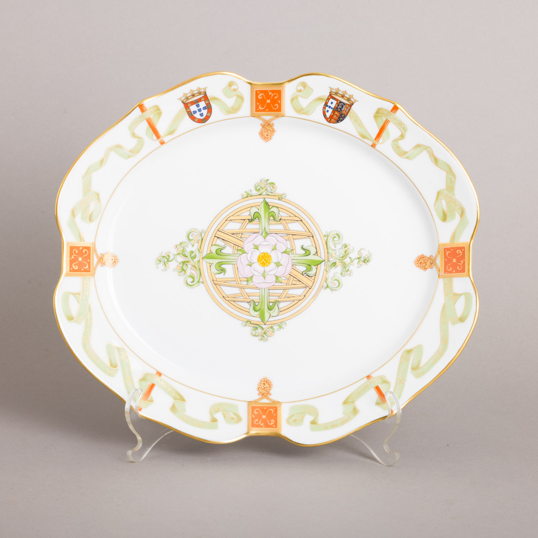 Em porcelana moldada (1980-1992), decoração policromada e dourada "Esfera Armilar e armas de D. João I e da Rainha Dona Filipa de Lencastre". Edição limitada a 1500 peças comemorativa da visita a Portugal de S.A.R. os Príncipes de Gales - Fevereiro 1987.Sinais de uso. Dim.: 27,5x25 cm.