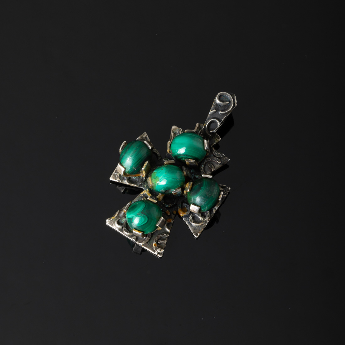 Em prata relevada, cravejada com contas em malaquite. Sem marcas, ao abrigo do Decreto-Lei n.º 120/2017. Sinais de uso.
