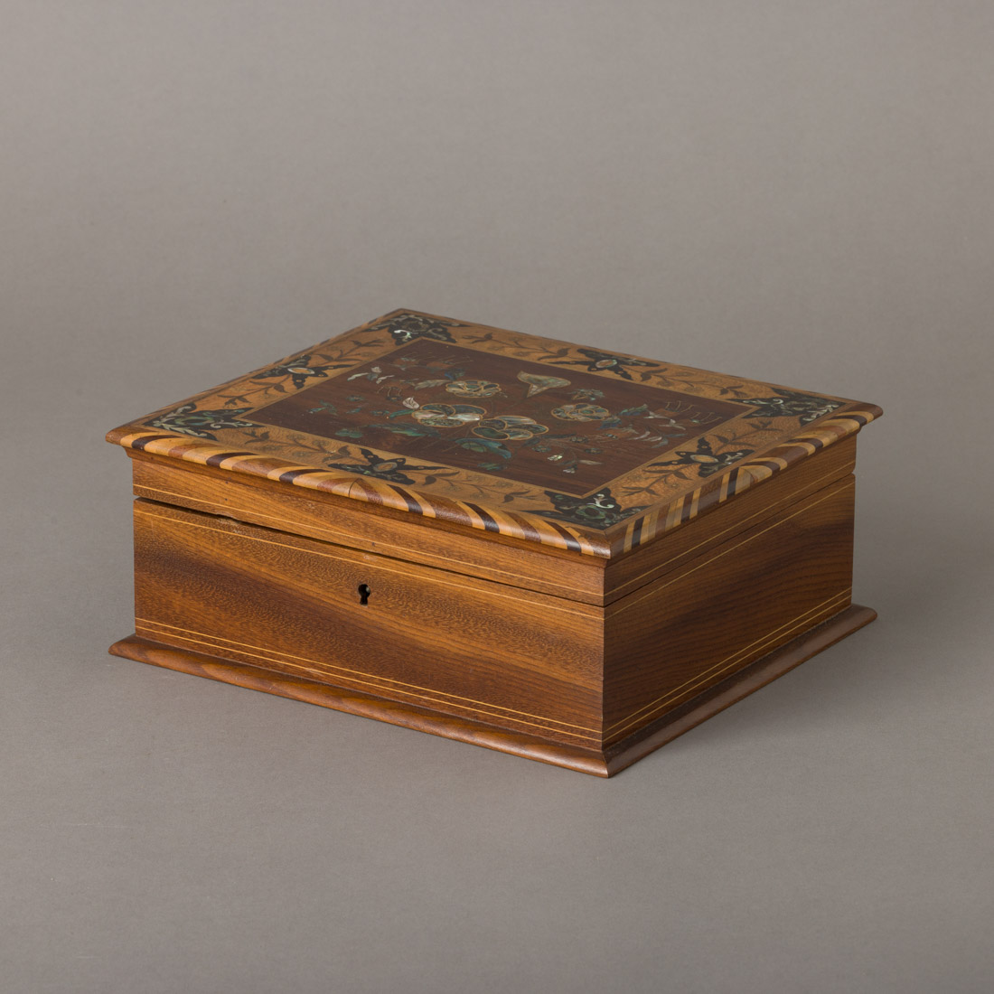 Em diferentes madeiras com embutidos em madrepérola "flores", interior forrado a veludo. Sinais de uso e pequenas falhas.