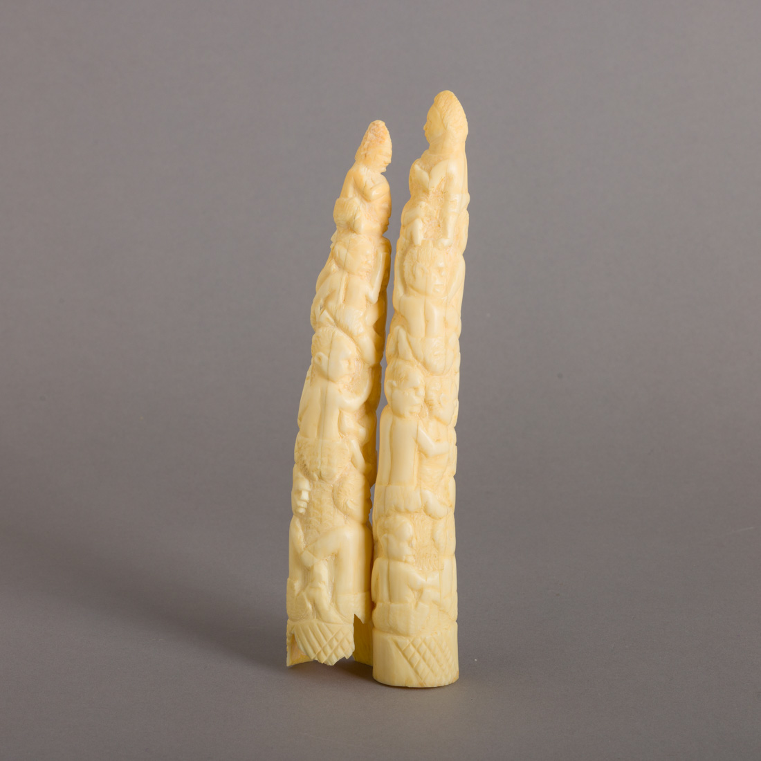 Esculpidos em dente de hipopótamo, representando Ujamaa (família). África. Falhas e pequenos defeitos.