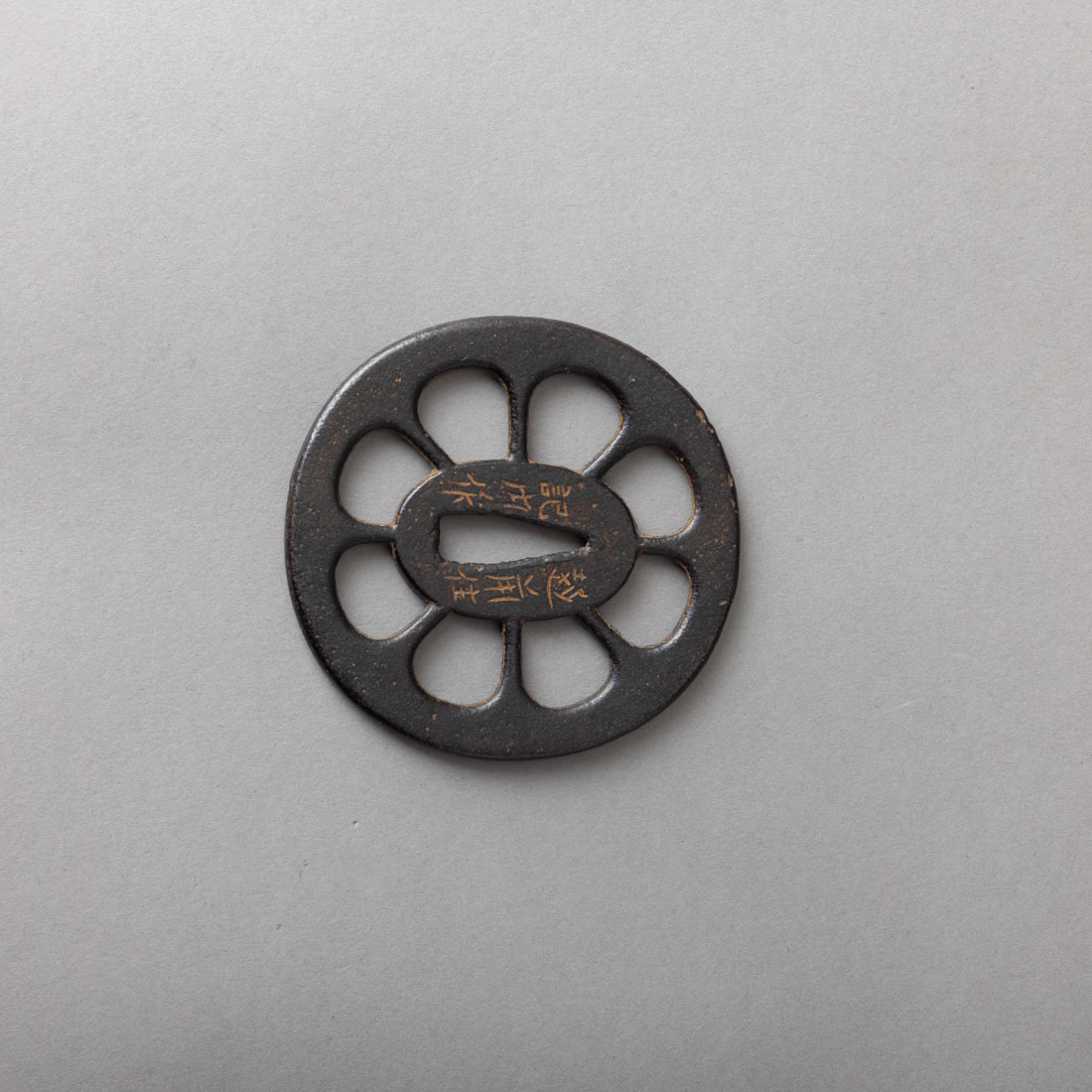 Em bronze vazado e relevado, com caracteres gravados. Japão. Sinais de uso.