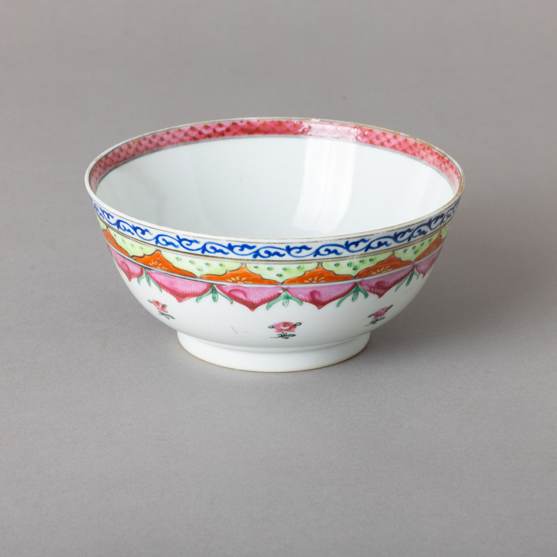 Em porcelana da China, Companhia das Índias, Séc. XIX, decoração com esmaltes policromados da família rosa "flores". Ínfima esbeiçadela e cabelo.