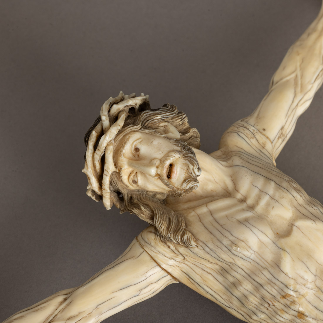 Escultura em marfim, parcialmente policromado. Séc. XIX. Pequenos restauros e pequena falha dedo.