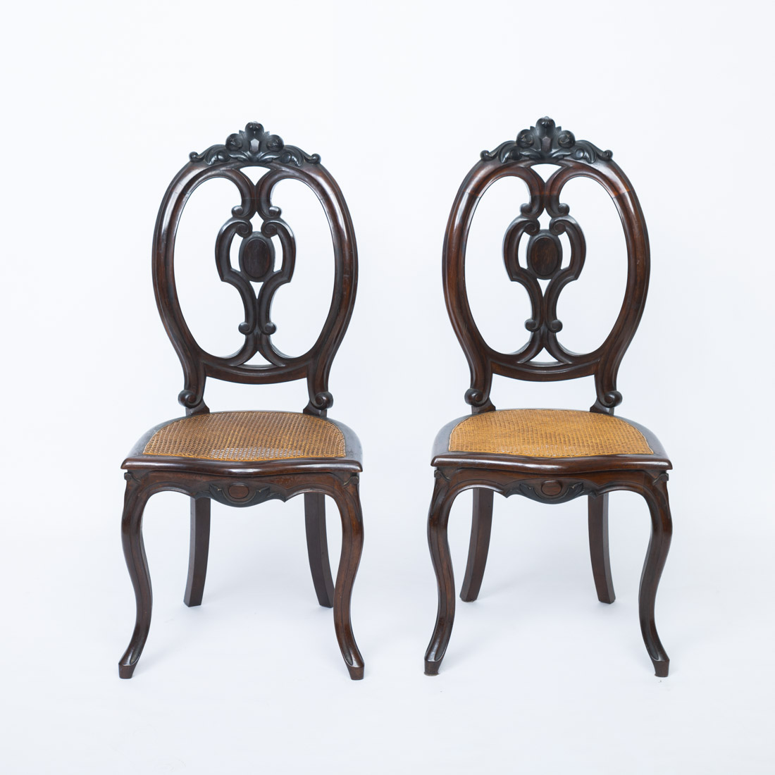 Em pau santo com entalhamentos, tabelas recortadas e vazadas, fundos em palhinha. Sinais de uso.