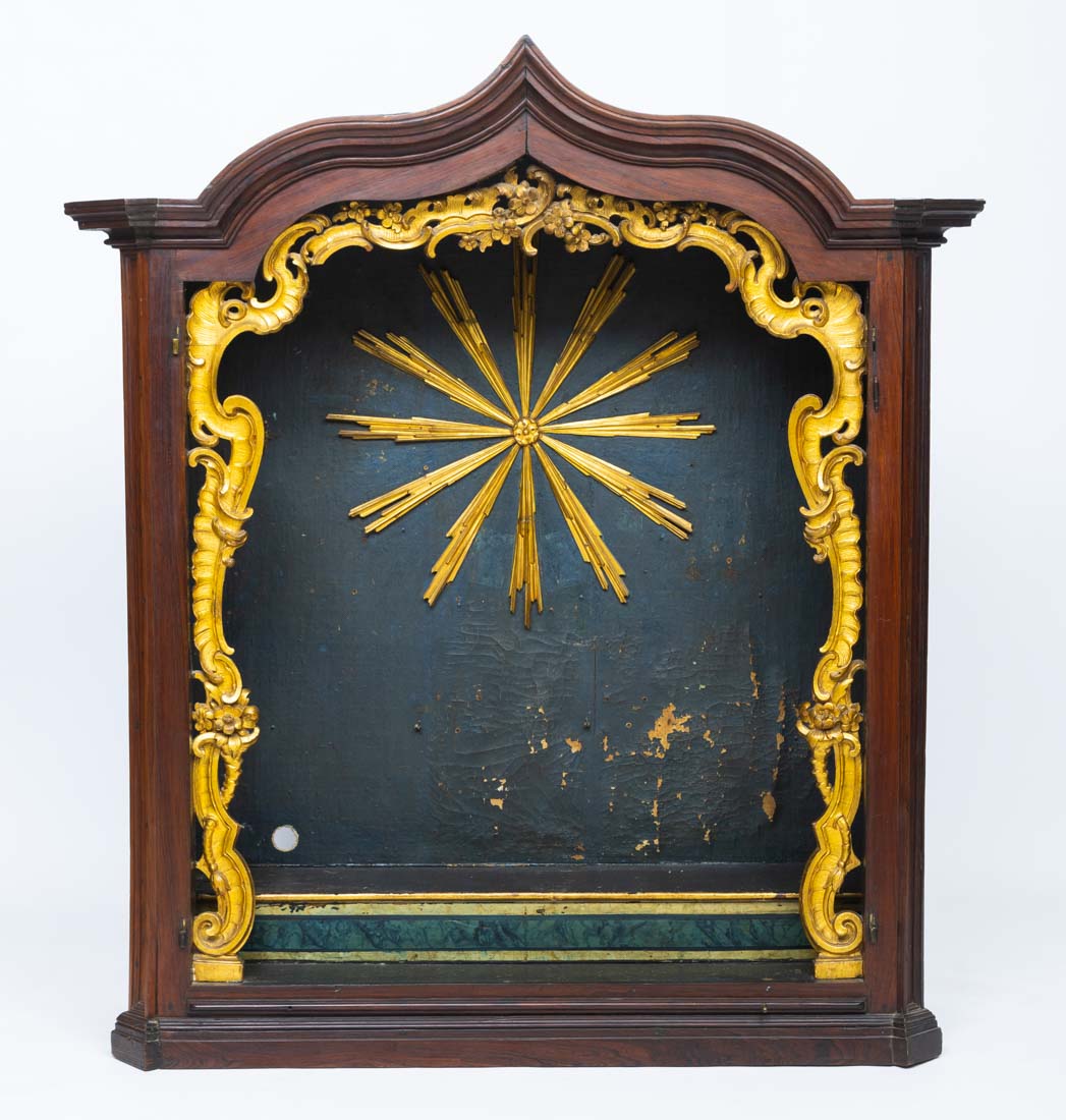 Em pau santo, interior com aplicação e moldura entalhada e dourada com elementos vegetalistas. Faltam portas, falhas e pequenos defeitos.