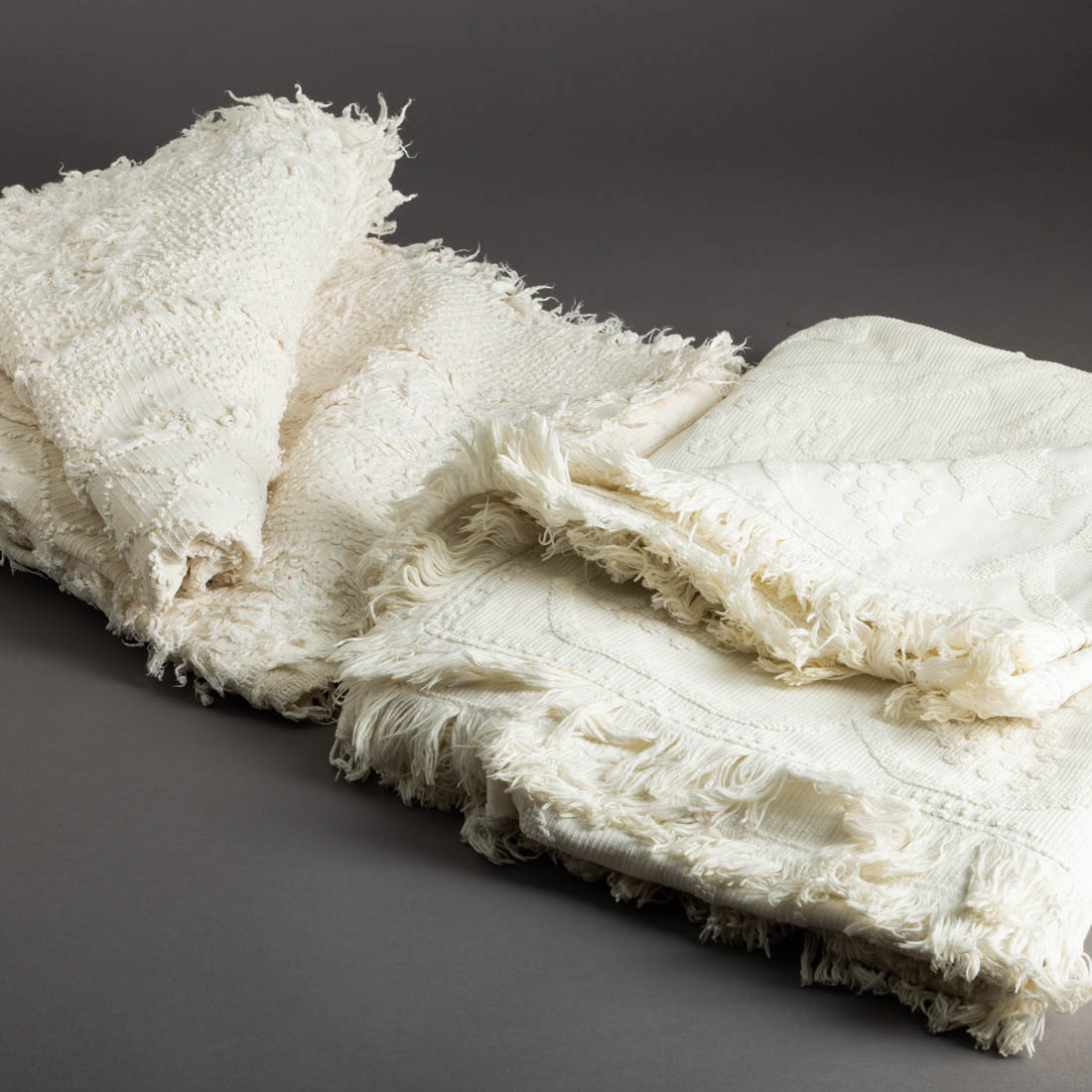 Em linho e algodão com puxadinhos. Sinais de uso e pequenas manchas.