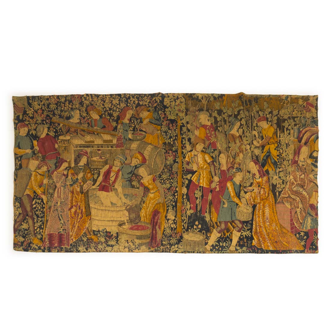 Estampagem sobre tecido, decoração policromada, representando cena da corte, forrada. Pequenos defeitos.