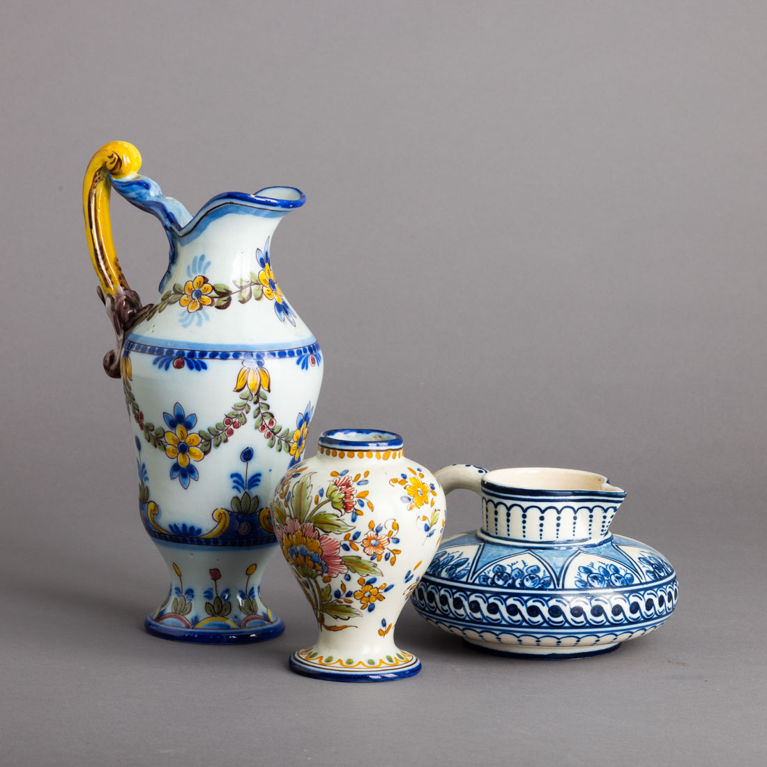 Em faiança portuguesa decoração policromada com motivos florais, marcada St´Anna e Battistini Maria de Portugal, jarro a azul com elementos vegetalistas fabrico Cavaco, Gaia. Ínfimas esbeiçadelas.