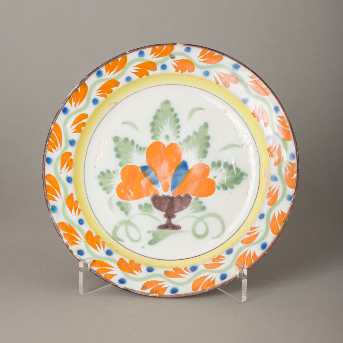 Em faiança portuguesa, decoração policromada "vaso com flores". Cabelo, restauro e orifício na aba