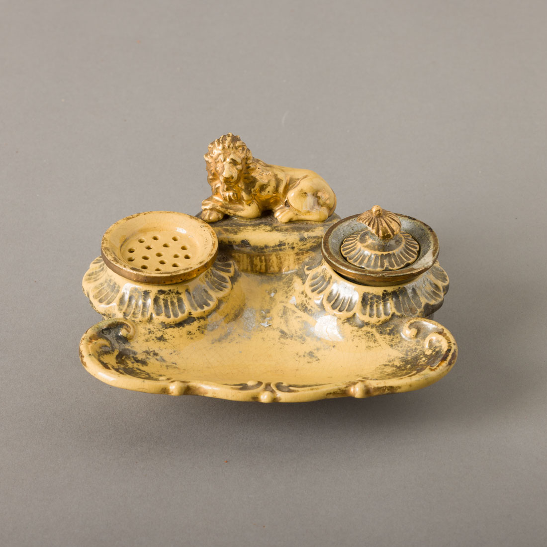 Em loiça pó de pedra, decoração relevada a dourado e prateado. Inglesa. Desgaste, craquelé, falhas no tinteiro.