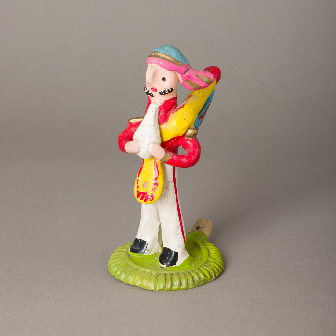 Escultura em barro de Barcelos, decoração policromada, assinada. Sinais de uso e defeito de fabrico no braço.