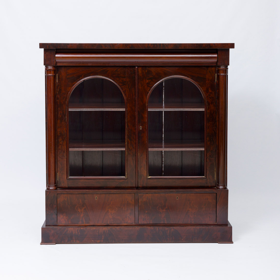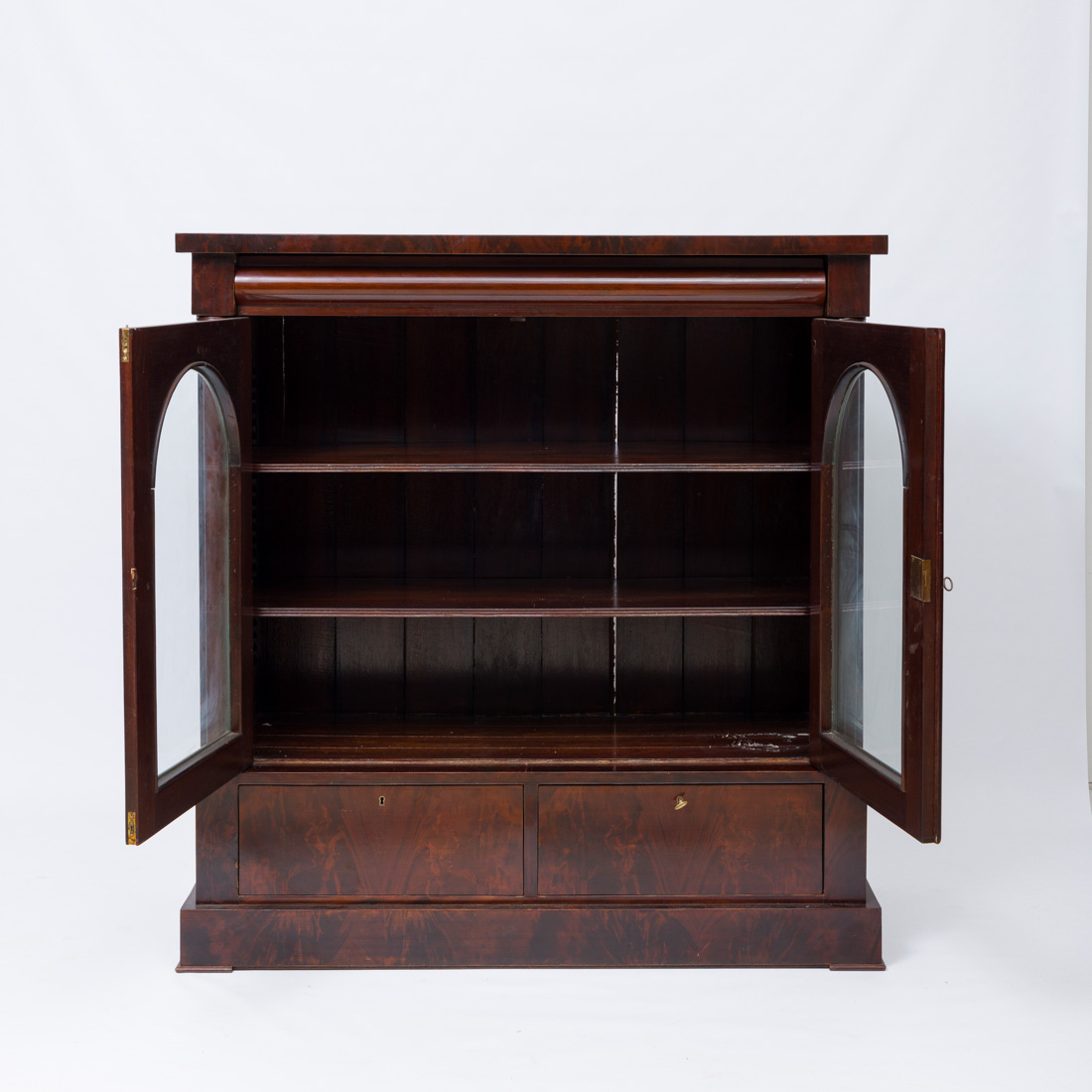 Em mogno e folheado a mogno, de duas gavetas e portas com vidros. Sinais de uso.