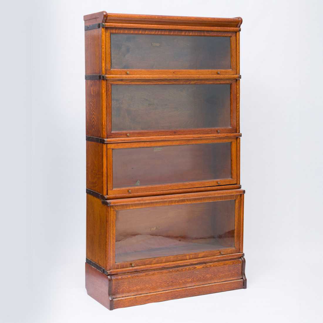 Em carvalho, composto por quatro módulos e base e cimalha independentes, portas de recolher em vidro. Marcado "The Globe Wernicke Co. Ltd. - London". Pequenos defeitos.