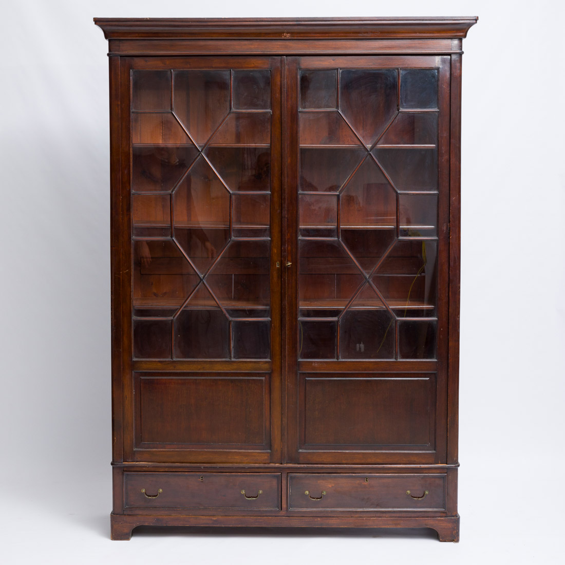 Em mogno de duas gavetas e portas com vidrinhos. Pequenos defeitos.