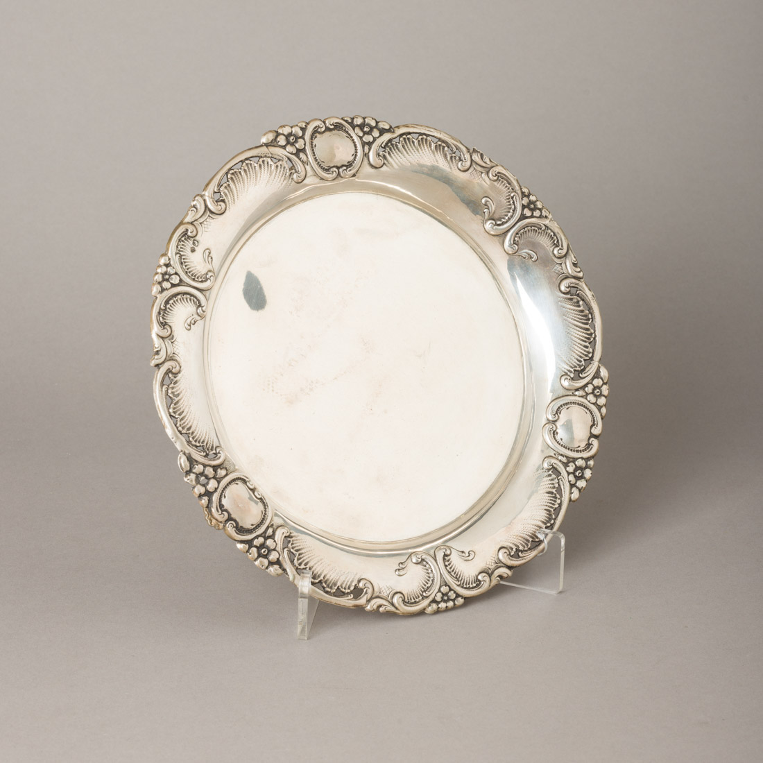 Em prata portuguesa contraste javali (1887-1937) de 833, aba relevada e vazada decorada com enrolamentos e flores, pés vazados. Pequenas falhas e restauros no bordo.