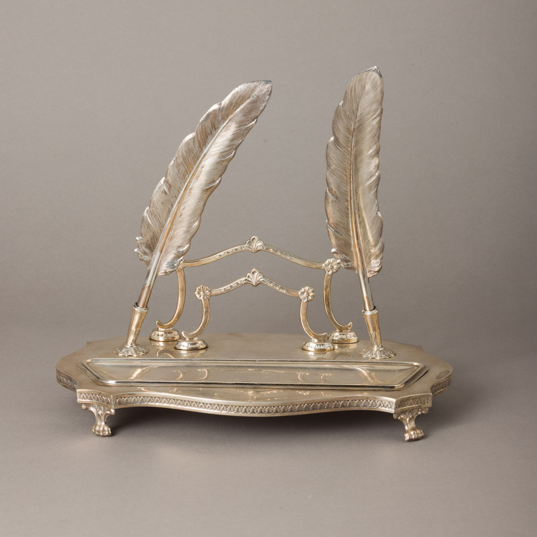 Em prata espanhola marcada Pedro Duran, remarcada contraste águia (pós 1985) de 925, decoração relevada e gravada, pés de garra, com dois suportes e penas. Sinais de uso.