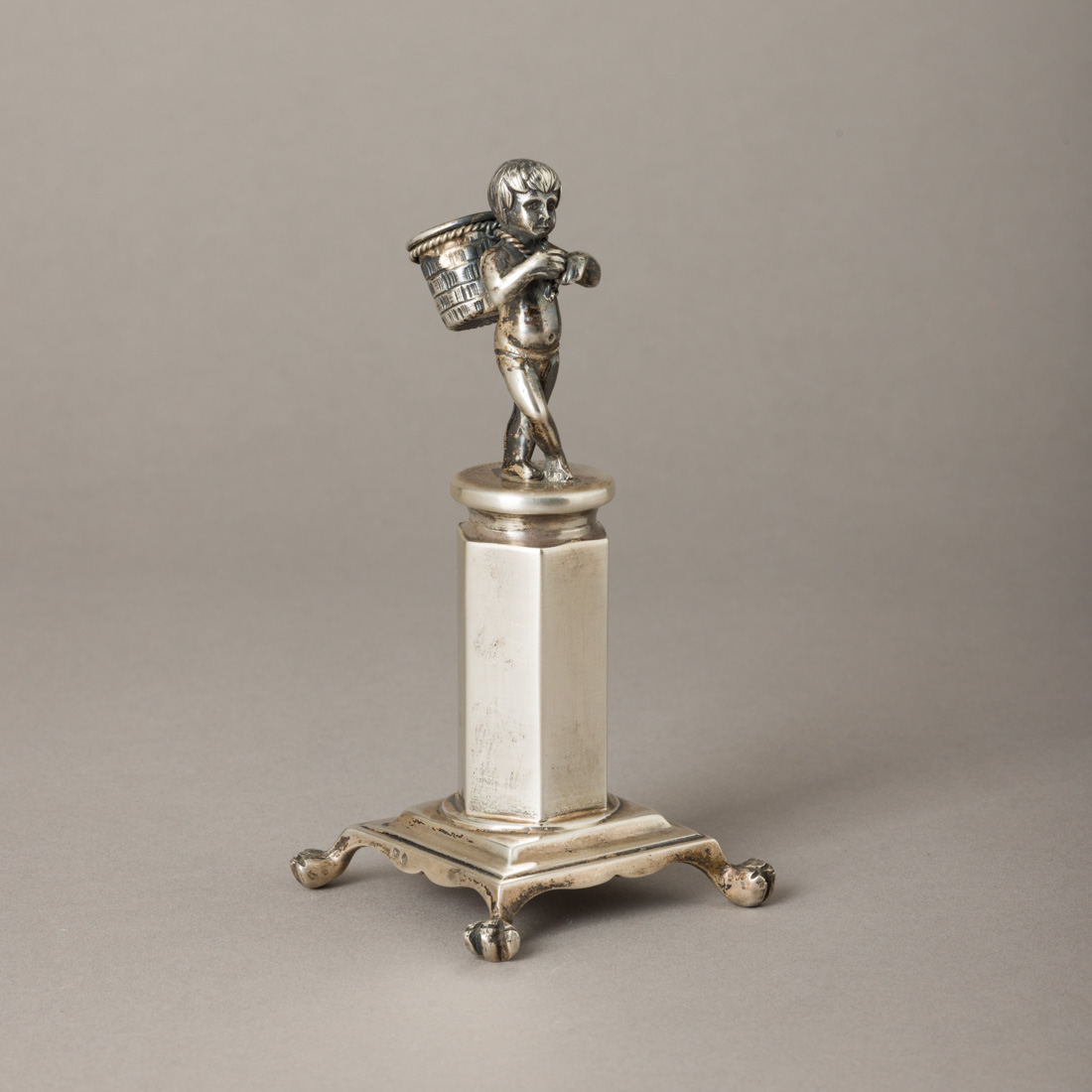 Em prata portuguesa contraste águia (pós 1985) de 835, decoração relevada, base quadrangular e pés de garra.