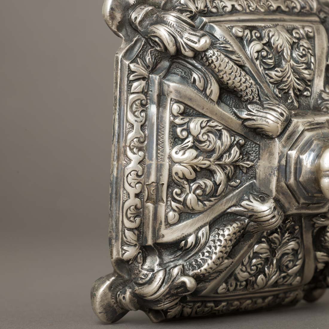 Em prata portuguesa Séc. XIX, marca de ensaiador do Porto (P-49) José Almeida Brandão Aguiar Penetra e de ourives (P-288) Guilherme Guedes Mancilha, decoração relevada "elementos vegetalistas e golfinhos". Leves amolgadelas bobeches. Peso aprox.: 1100 g.Dim.: 24 cm.