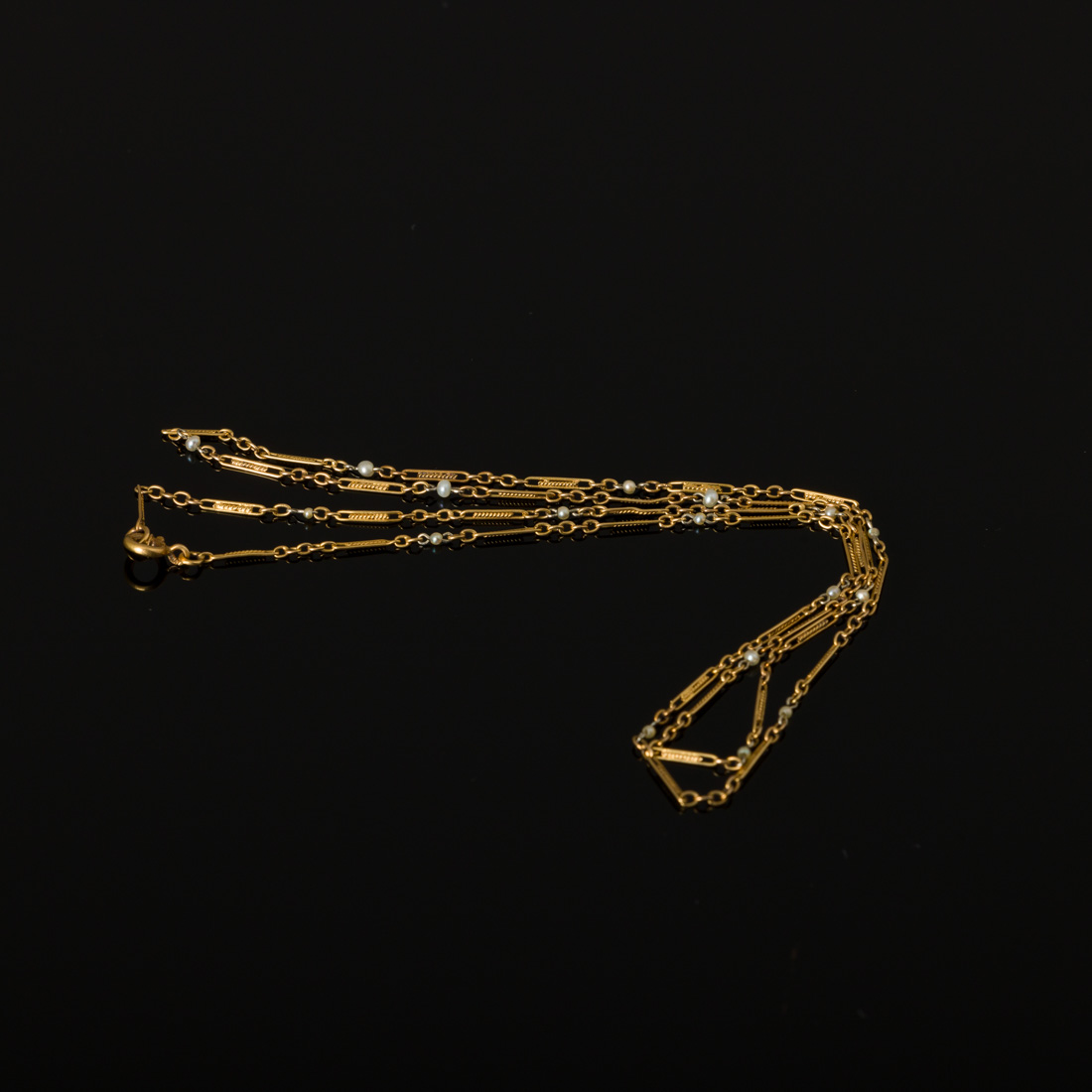 Em ouro português de 19.2Kt., contraste tigre (1887-1937), malha de elos intercalada com pérolas naturais (não testadas) com desgaste. Sinais de uso.