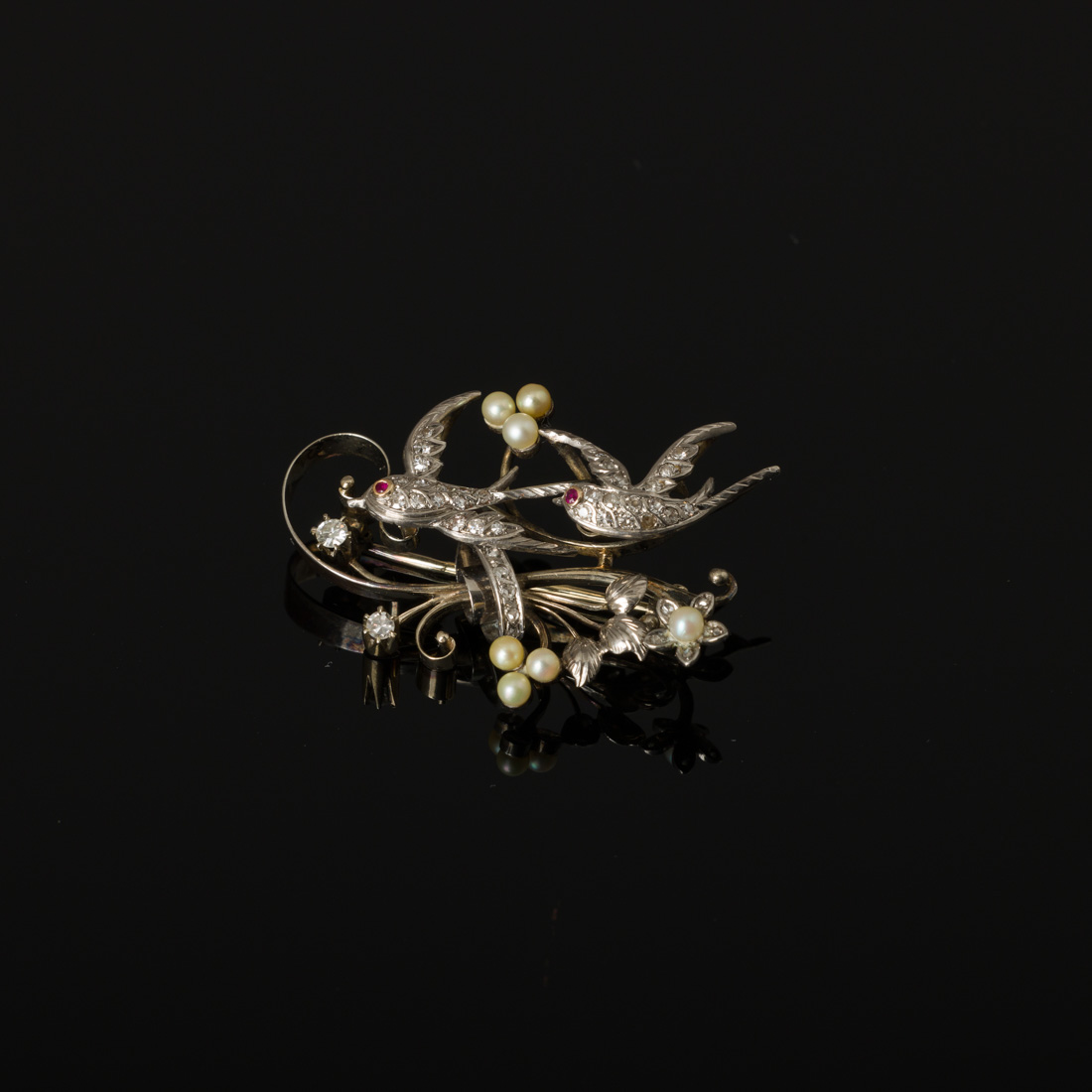 Em ouro branco português de 19,2Kt., contraste formiga e galo (1938-1984) cravejado com diamantes em talhe de brilhante e rosa, pérolas naturais (não testadas), andorinhas com olhos em rubi, Sinais de uso.