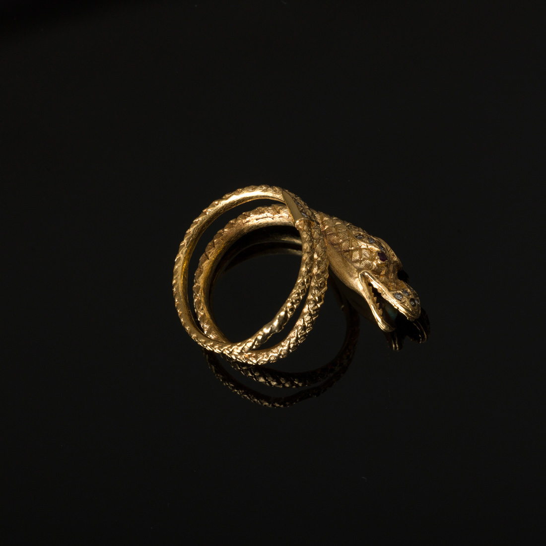 Em ouro português de 19.2Kt., contraste dragão e galo (1938-1984) cinzelado e cravejado com diamantes talhe brilhante, olhos em ametistas. Ajustável. Sinais de uso e falta um brilhante.