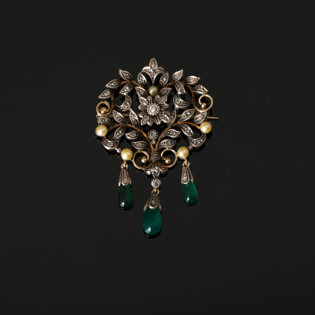 Em ouro e prata marcas sumidas, cravejado com diamantes em talhe rosa e um talhe brilhante, pérolas de cultura (não testadas) e três pedras verdes em talhe gota. Sem marcas, ao abrigo do D/L. nº 120/2017. Sinais de uso. Peso aprox.: 11,7g. Dim.: 5x3,5 cm.