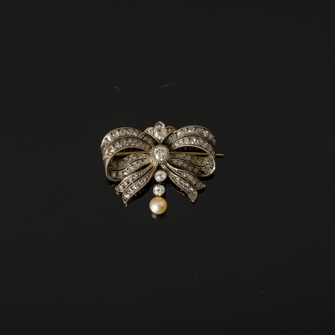 Em ouro português e prata cravejada com diamantes em talhe rosa e quatro diamantes em talhe antigo de brilhante e pérola de cultura não testada. Sem marcas, ao abrigo do D/L n.º 120/2017. Sinais de uso, falta uma rosa. Peso aprox.: 7,7 g. Dim: 2,5x3,2 cm.