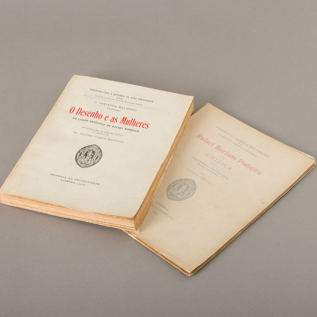 "O Desenho e as Mulheres" por J. Saavedra Machado com ilustrações do glorioso artista e prefácio do Dr. Arlindo Camilo Monteiro, Coimbra 1934 e "Rafael Bordalo Pinheiro e a Crítica" Edições da Imprensa da Universidade, Coimbra, 1924. Picos de acidez e páginas ainda por abrir.