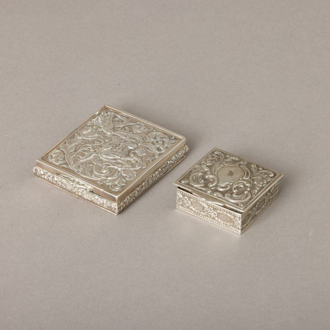 Em prata, uma espanhola de 915 marcas de garantia de teor (pós 1934), outra sem marcas, decoração relevada com elementos vegetalistas e animais. Sem marcas, ao abrigo do D/L. n.º 120/2017. Sinais de uso. Peso aprox.: 107 g. Dim: 1,7x4x4,5; 1,3x5,5x6,8 cm.