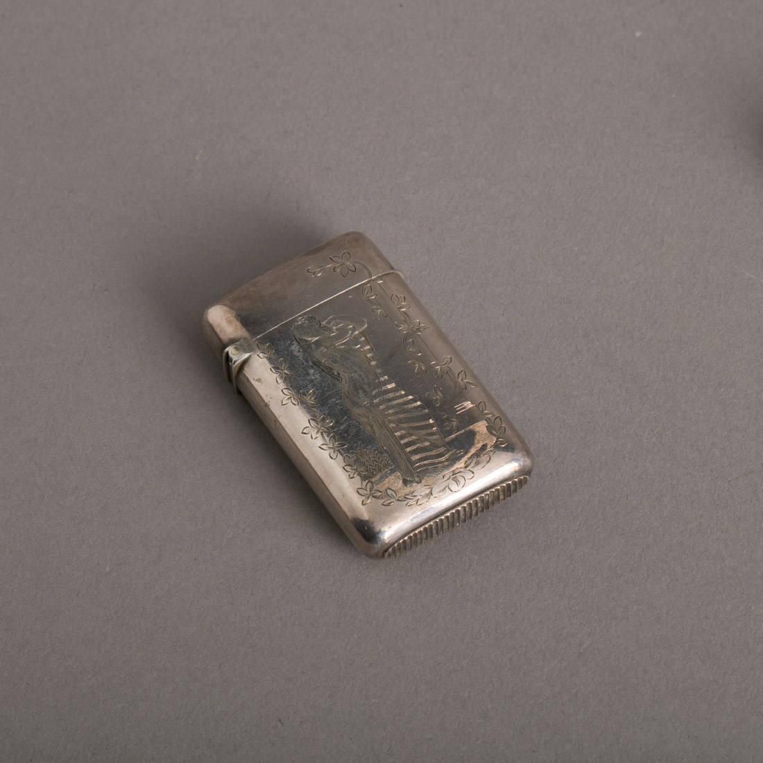 Em prata francesa, marcas de garantia, decoração gravada "figura feminina", monogramada. Sem marcas portuguesas, ao abrigo do Decreto-Lei n.º 120/2017. Sinais de uso.