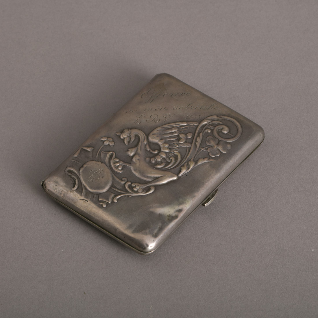Em prata portuguesa contraste javali (1887-1937) de 833, decoração relevada "dragões", com monograma e dedicatória. Sinais de uso, amolgadelas.