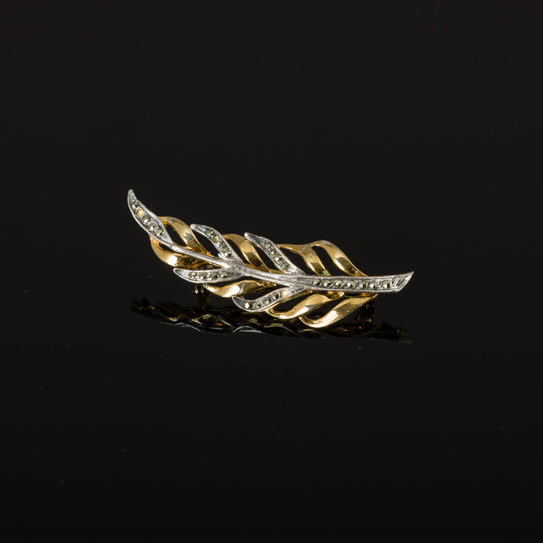 Em prata portuguesa bicolor contraste águia (pós 1985) de 925, cravejada com marcassites. Fecho em metal. Sinais de uso.