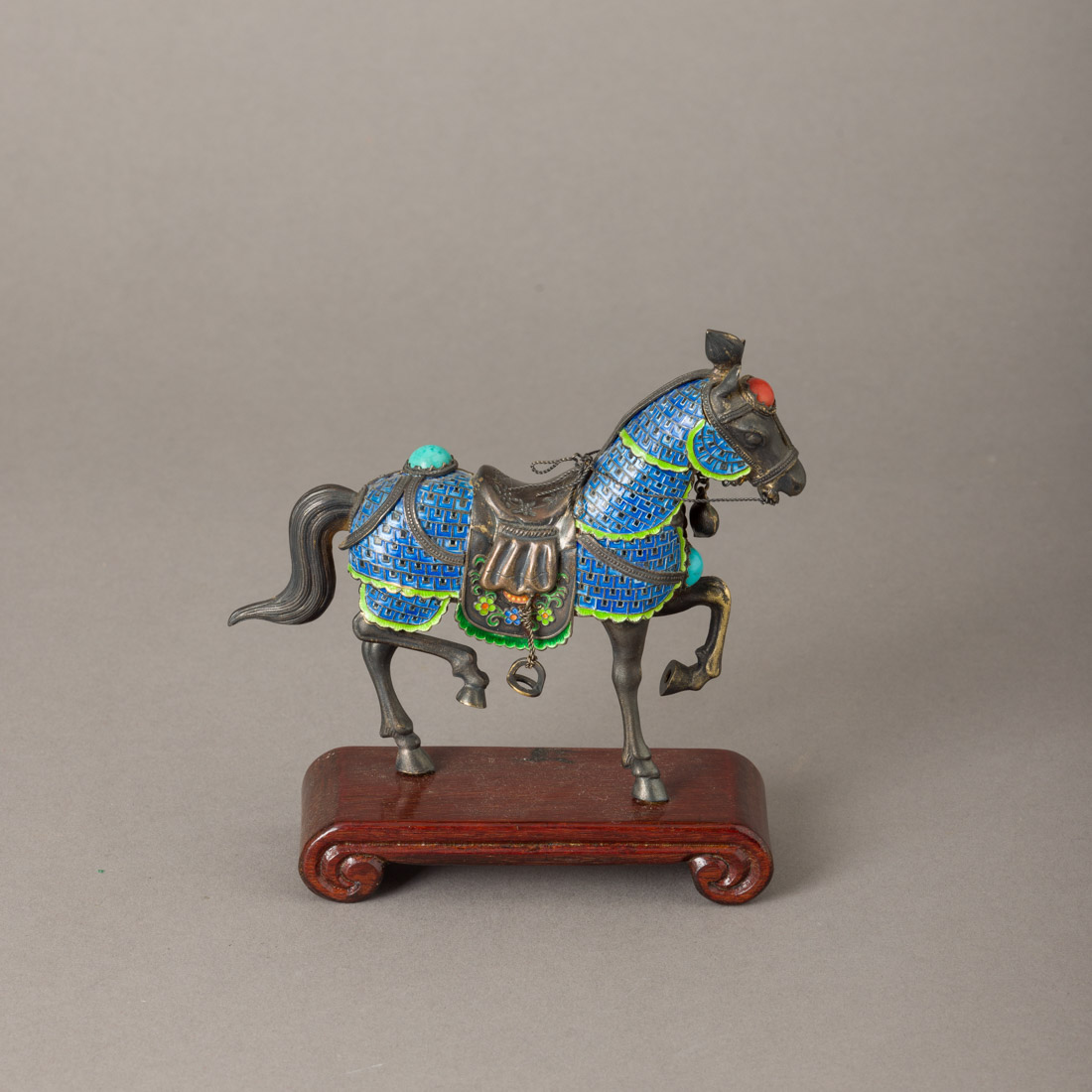 Escultura em prata marcas não identificadas, decorada com esmaltes policromos e pedras coloridas, base em madeira. Sem marcas, ao abrigo do Decreto-Lei n.º 120/2017. Sinais de uso.