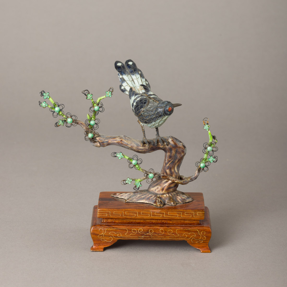 Escultura em prata de 825 decorada com esmaltes policromos, base em madeira. Sem marcas, ao abrigo do Decreto-Lei n.º 120/2017. Sinais de uso.