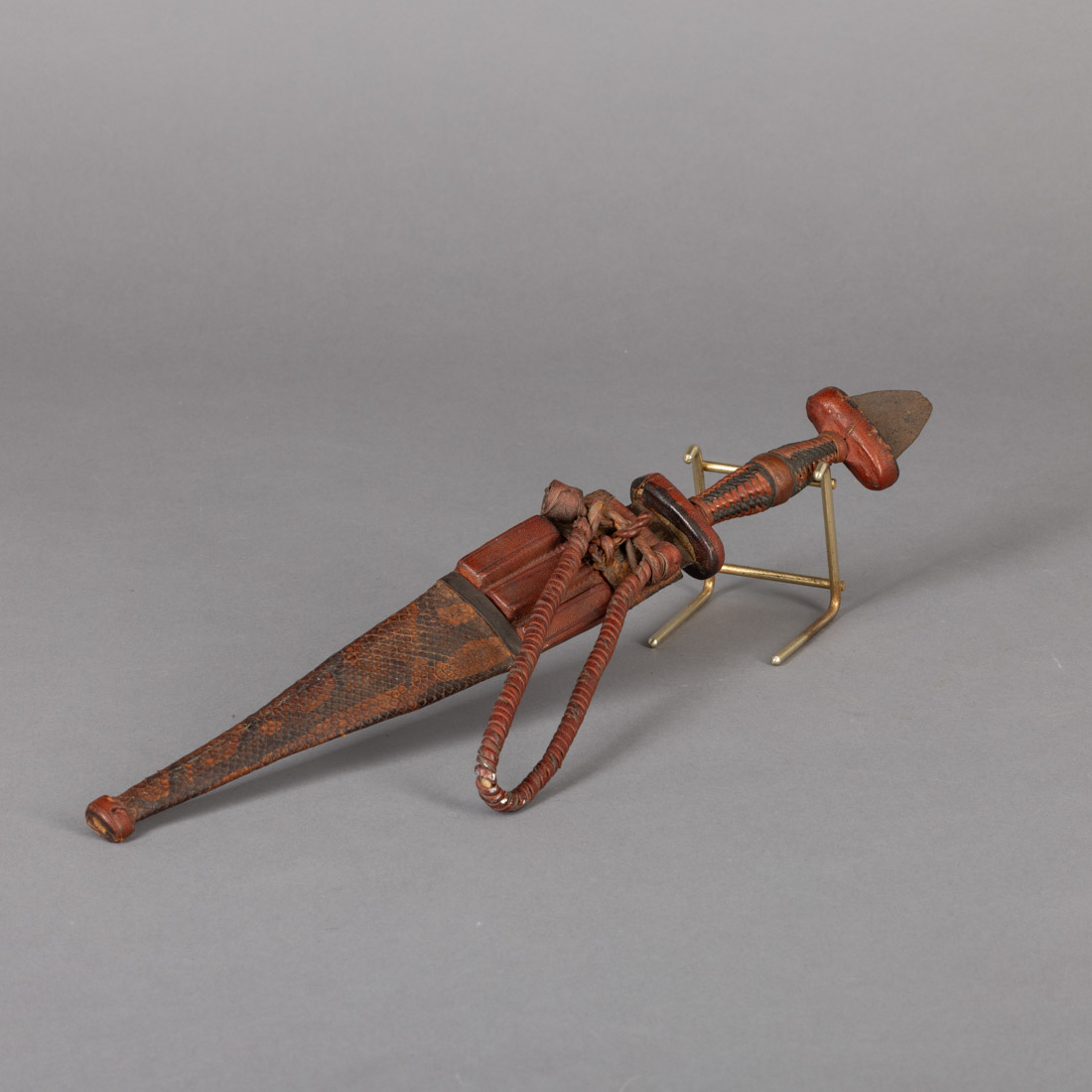 Possivelmente guineense dos meados do Séc. XX. Em muito bom estado. Punho e bainha em couro, impecáveis, com partes cobertas a pele de ofídios. Lamina em ferro batido.
