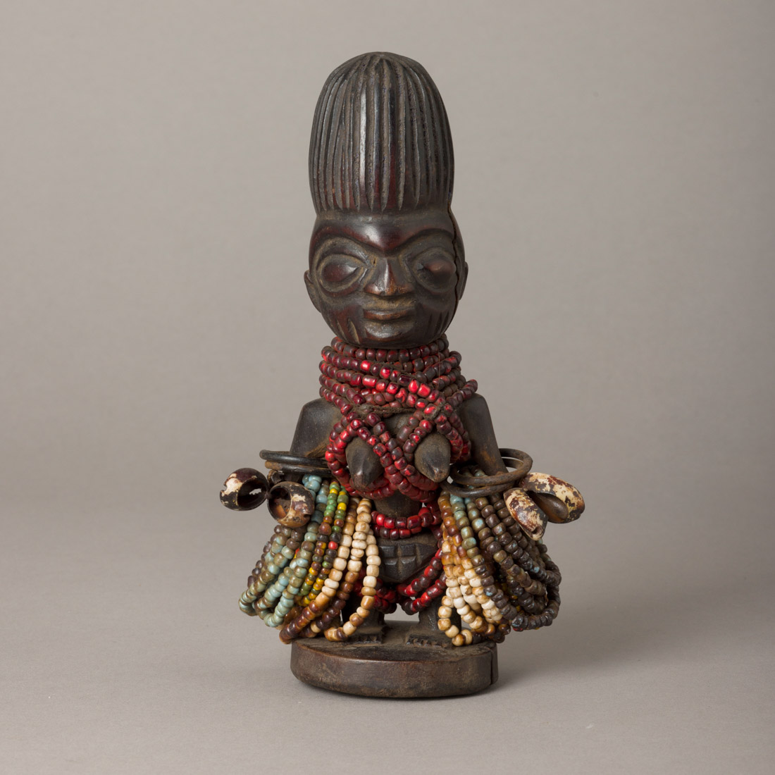 Escultura em madeira representando figura feminina. Africana, possivelmente Ibeji, Nigéria. Falhas e pequenos defeitos.