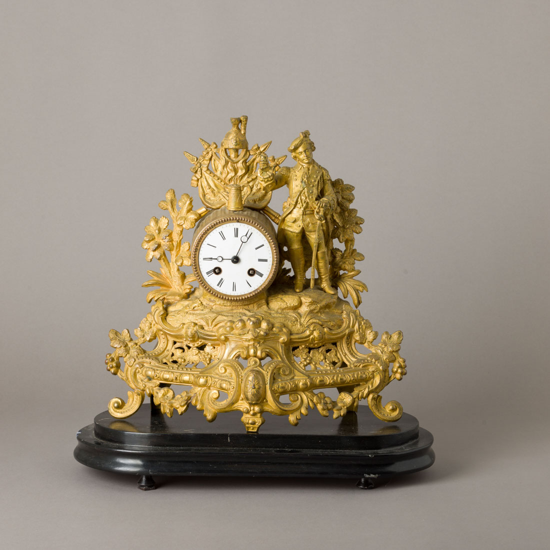 Em bronze de arte dourado, decoração relevada com alegoria, mostrador em esmalte com numeração romana. Autonomia de oito horas, toca horas e meias horas. Base em madeira escurecida. Sinais de uso.