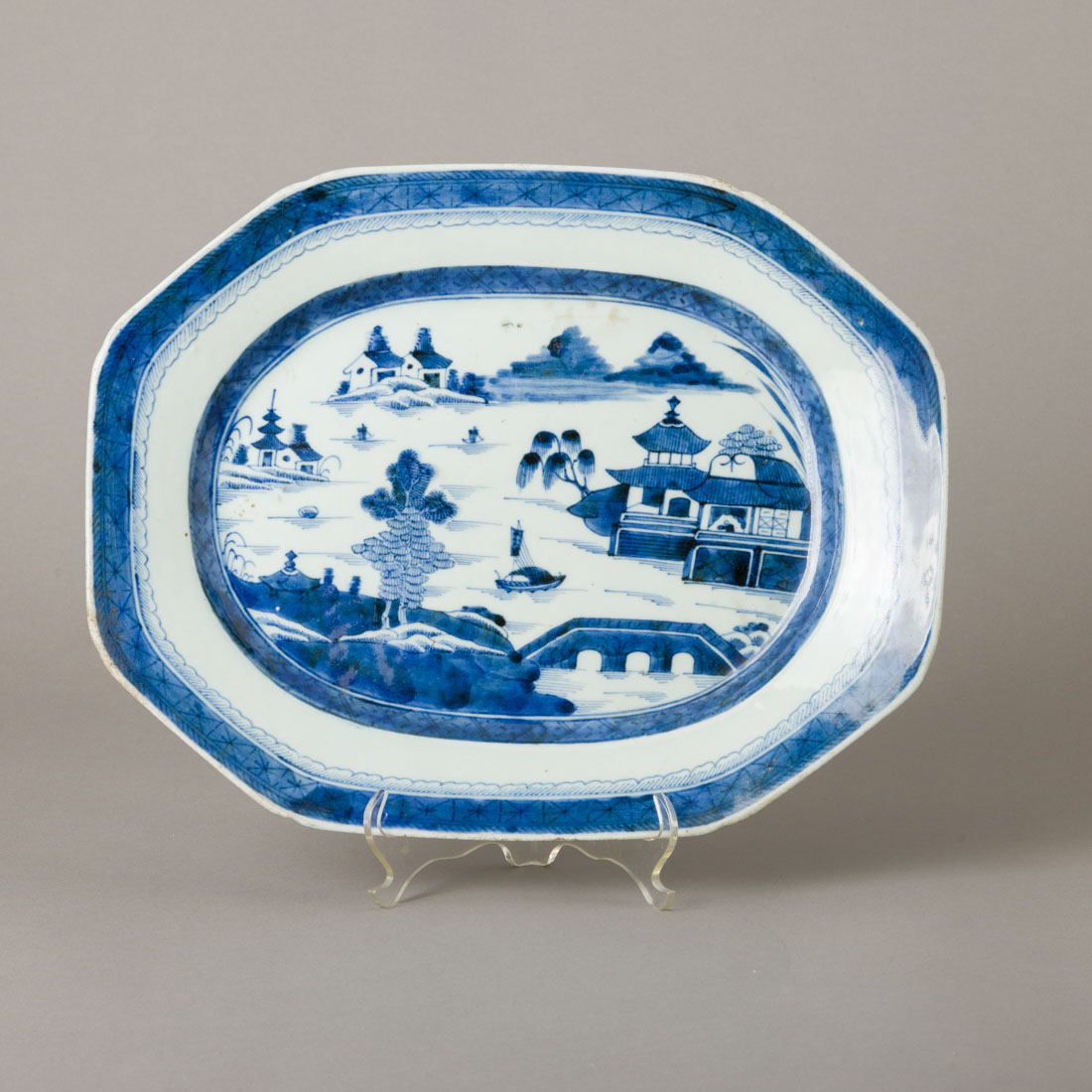 Em porcelana da China, Séc. XIX, decoração a azul "Cantão". Sinais de uso, ligeiro desgaste.