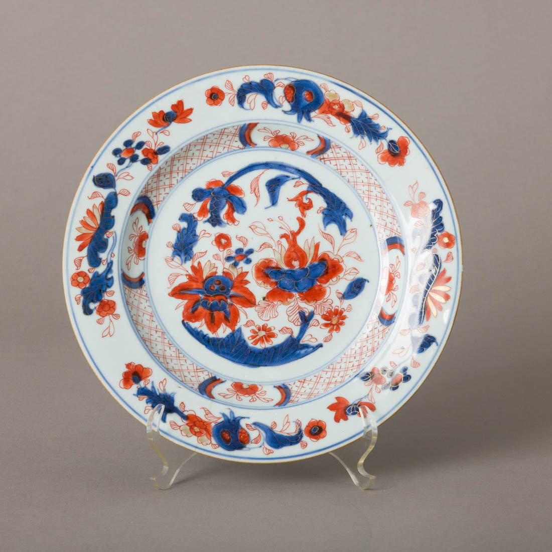Em porcelana da China, Companhia das Índias, Séc. XVIII, decoração "Imari" a rouge de fer, azul e dourado "flores e frutos". Cabelos e pequena esbeiçadela.