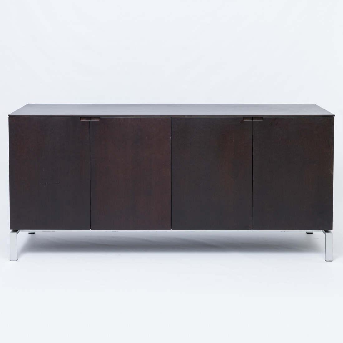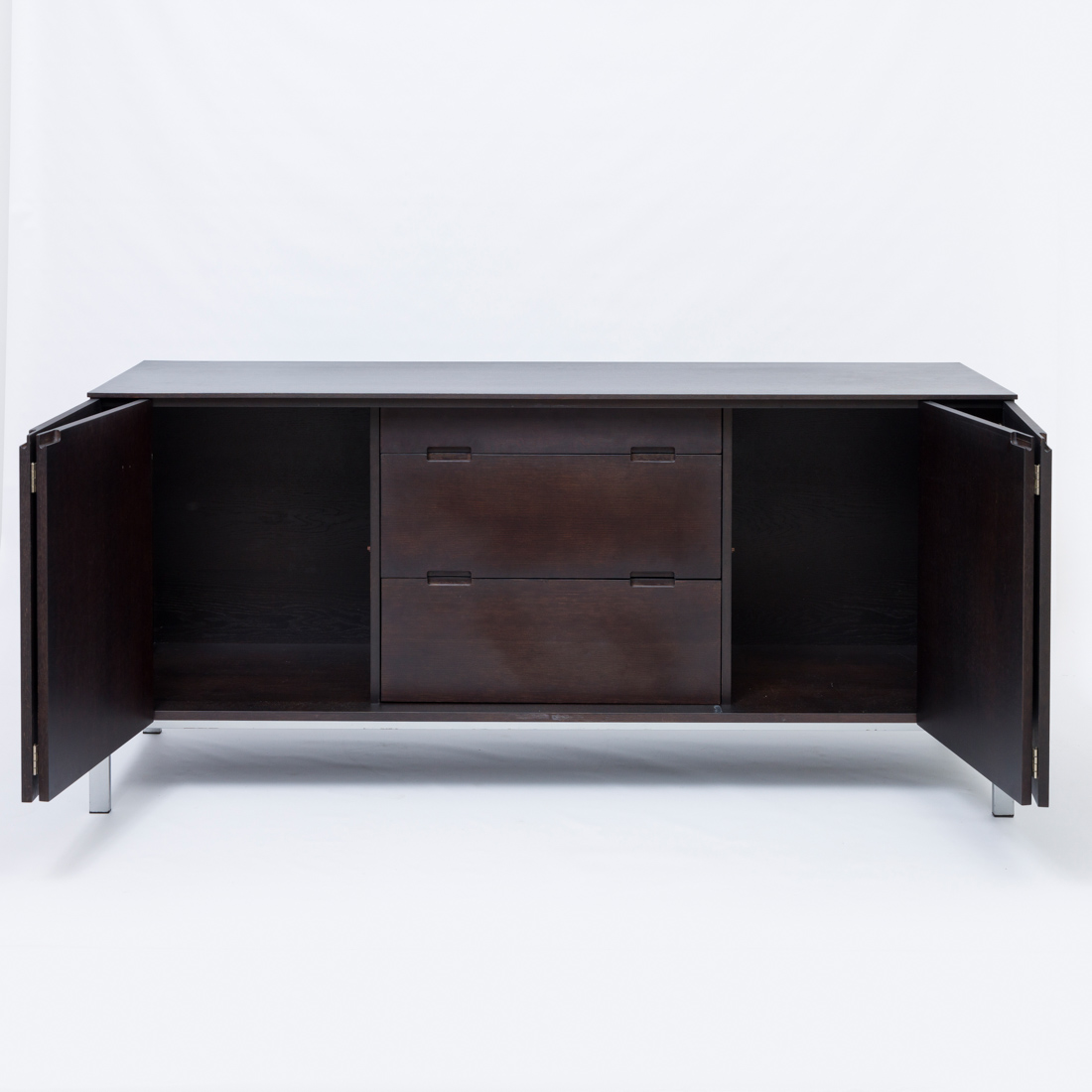 Em madeira e folheado a madeira escurecida, portas retráteis, pés em metal. Sinais de uso.