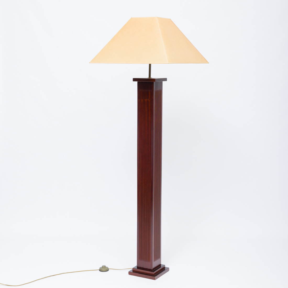 Em madeira escurecida de formato quadrangular, abat-jour em tela. Sinais de uso.